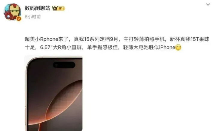 另外,博主@数码闲聊站 的一份爆料中提到过,“超美小Rphone来了,真我15系列定档9月,主打轻薄拍照手机,新杯真我15T果味十足,6.57"大R角小直屏,单手握感极佳,轻薄大电池胜似iPhone”。