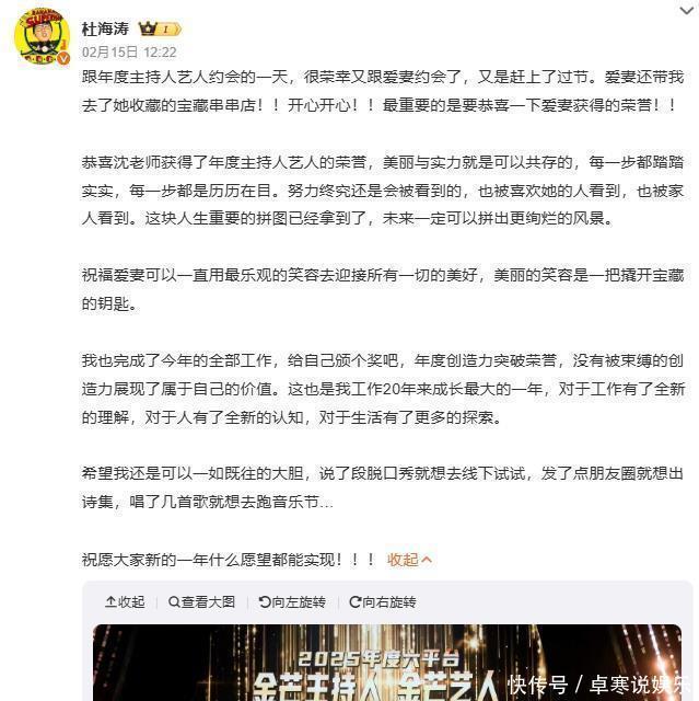 照片中互动温馨,而文案细节更显用心。杜海涛不仅高调祝贺沈梦辰获奖,称赞其“美丽与实力可以共存”,更深情回顾妻子“每一步都踏踏实实”的职业成长。他将这块荣誉称为“人生重要的拼图”,祝福爱妻用“最乐观的笑容”迎接未来。与此同时,杜海涛也分享个人感悟,将2025年定义为工作20年来“成长最大的一年”,对工作、人际关系与生活有了全新认知,并流露出尝试脱口秀、出诗集、跑音乐节的大胆念头。网友焦点迅速聚集于两人“细水长流的爱情”,称其为“娱乐圈稳定夫妻的典范”。
