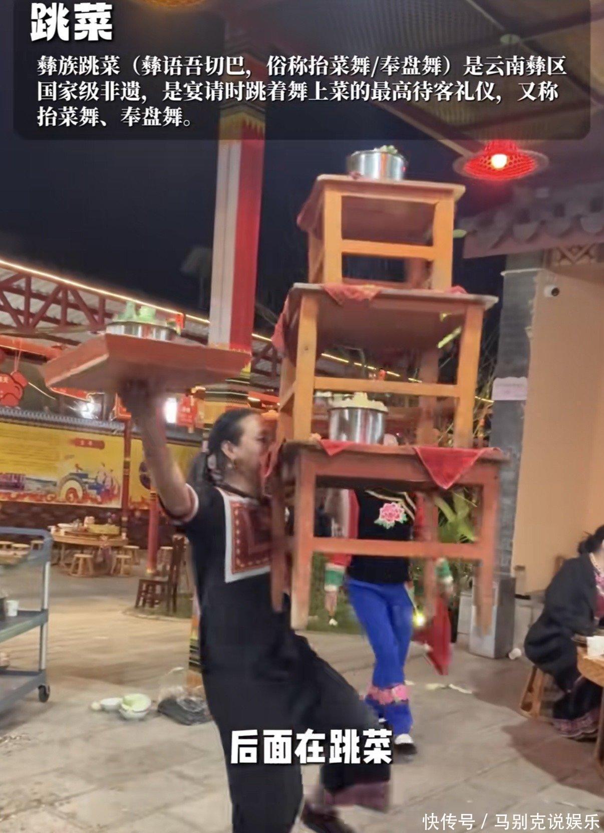 吃晚饭时,有个特别热闹的环节,叫作跳菜表演。云南彝族地区有个国家级非遗项目叫跳菜,就是办宴席时边跳舞边上菜。几张小桌叠起来摆满菜,托盘里也堆得高高的全是菜,这舞跳起来难度可真不小。
