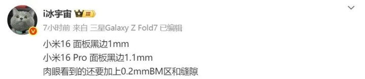 近日,博主@i冰宇宙 爆料,小米16面板黑边是1mm,小米16 Pro面板黑边是1.1mm,如果算上BM区和缝隙,上述数据还要再加上0.2mm。